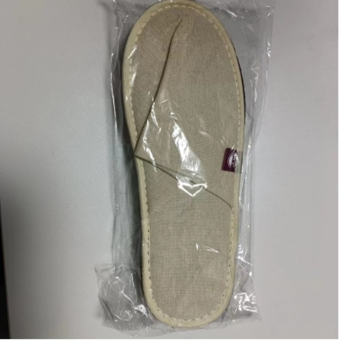 邦面为毛巾材质,内邦为拉毛布材质,脚面为毛巾材质,垫5mm脚后跟,6mm热熔胶防滑底,布条分浅咖啡色和本色,可洗,吊2只水洗标印logo,尺寸为儿童尺寸,入透明袋包装。