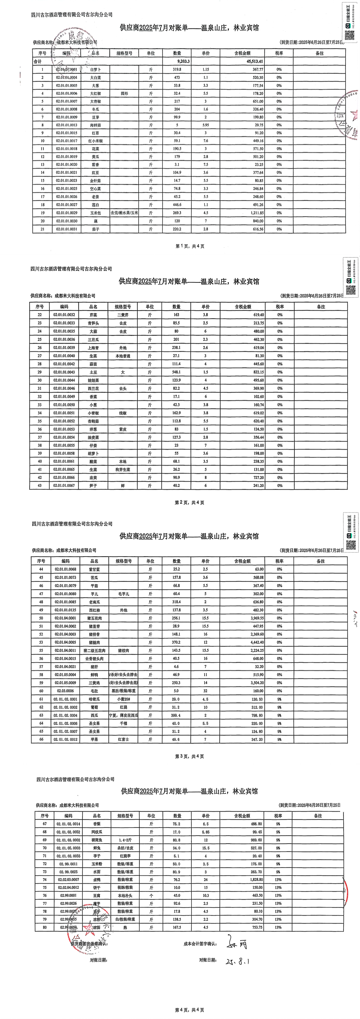 花园宾馆2025年7月对账单 合计金额:26194. 36元