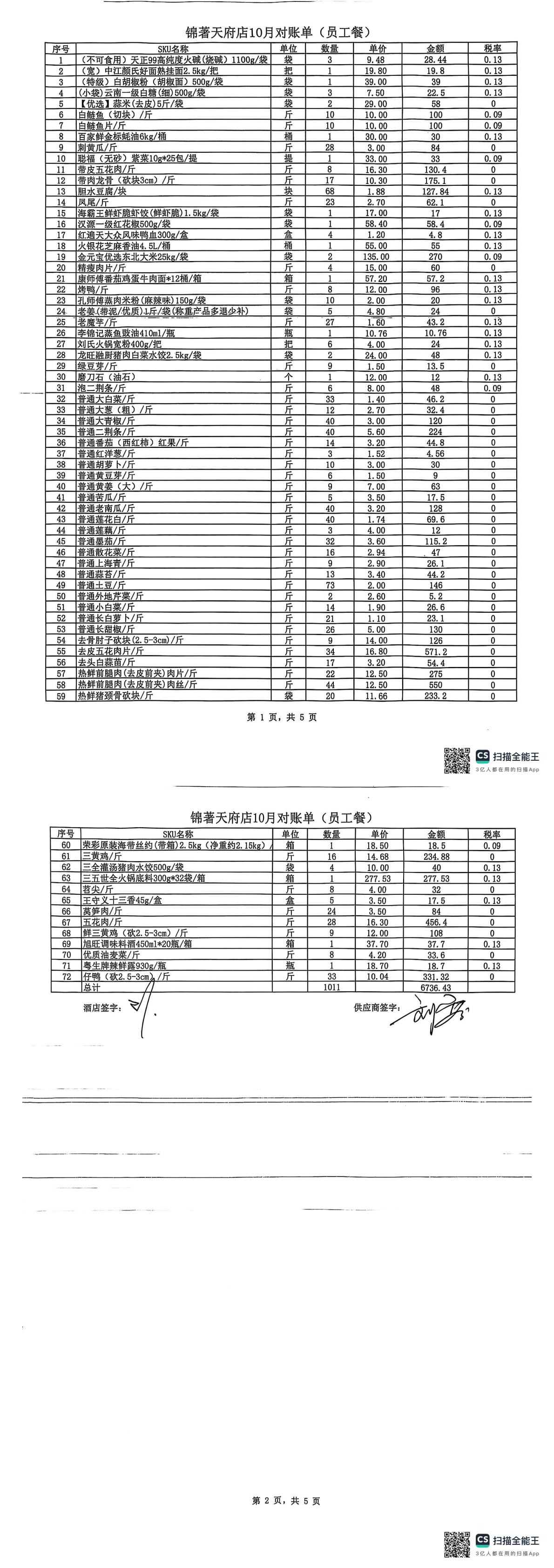 新良酒店客餐9.26-10.25对账单 合计金额:10132.04