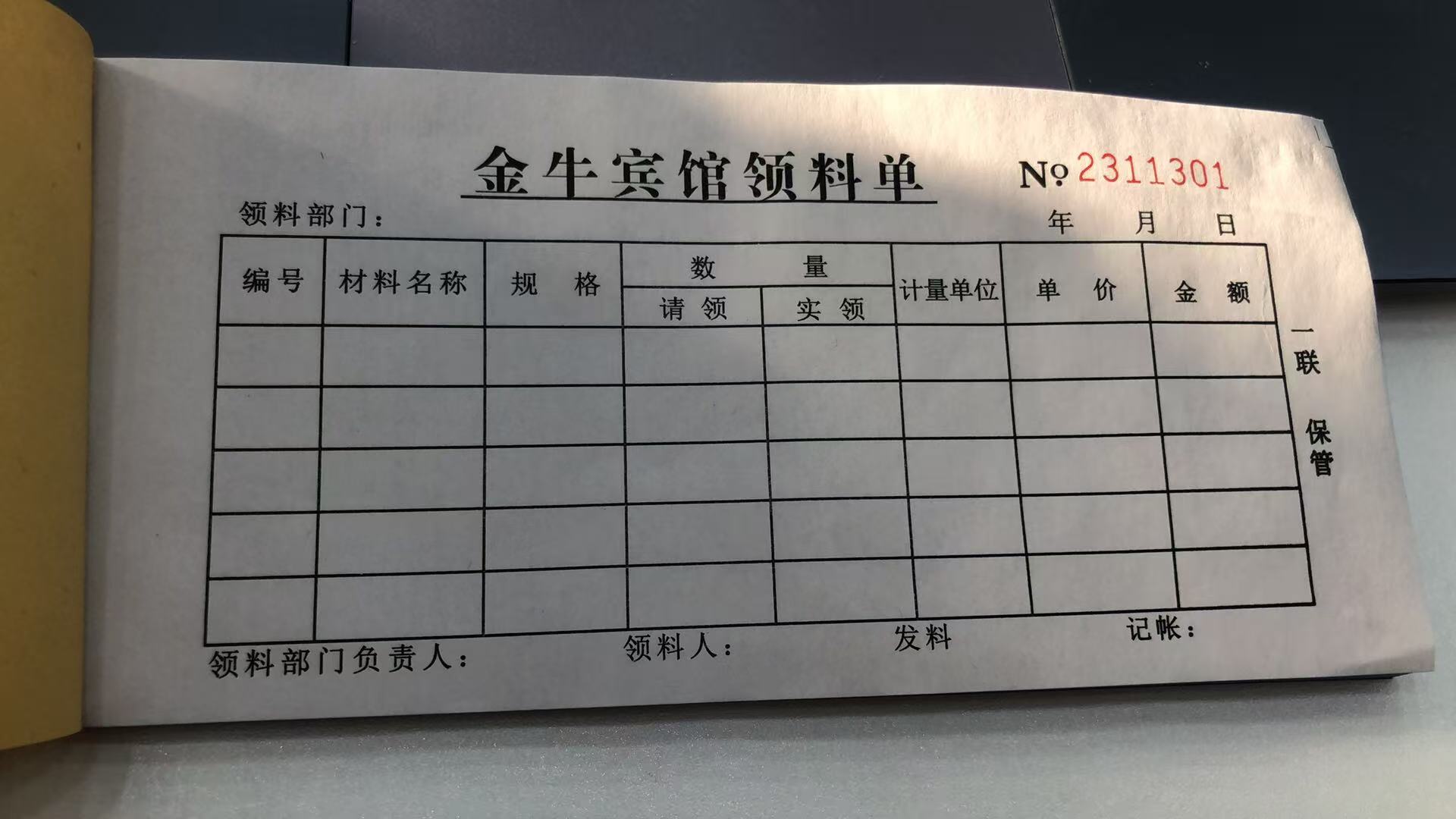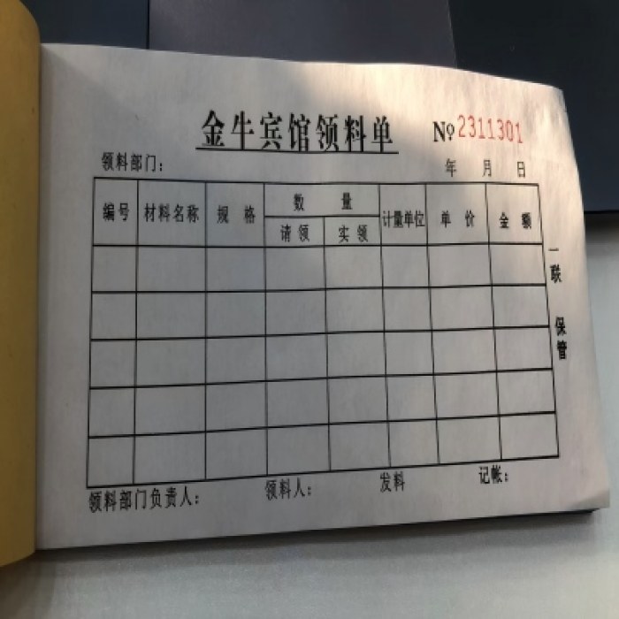 领料单 四联 19CM*9CM 带复写的4连单(白红绿蓝),边联不在一起 单面单色 包壳 打号 25套一本 100张/本