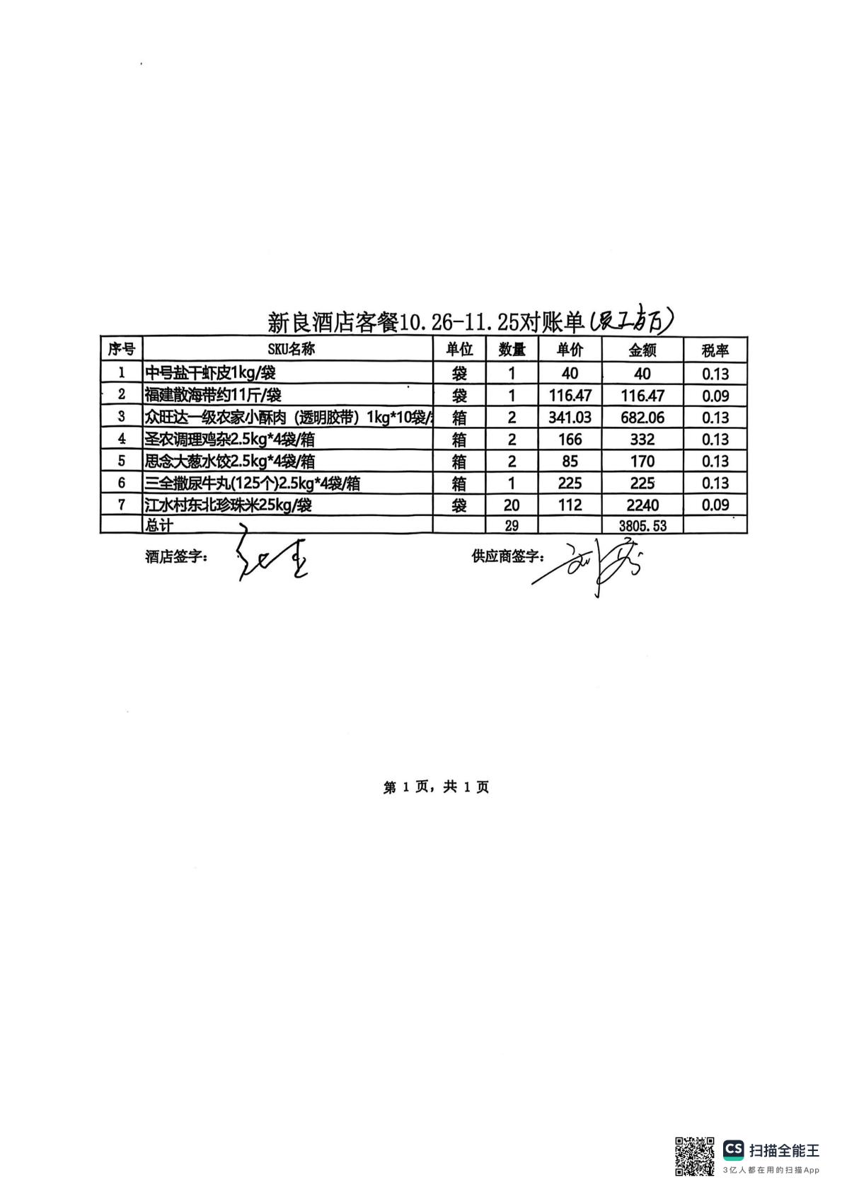 新良酒店客餐9.26-10.25对账单 合计金额:10132.04
