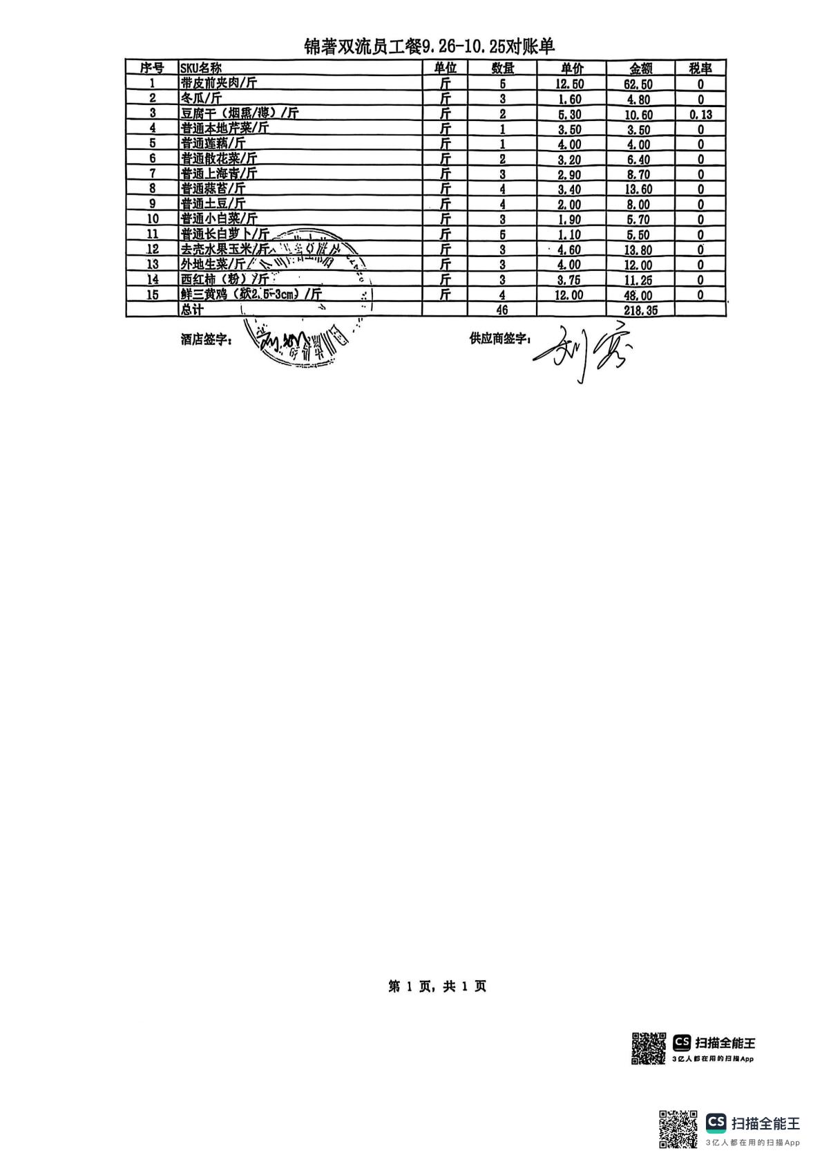 新良酒店客餐9.26-10.25对账单 合计金额:10132.04