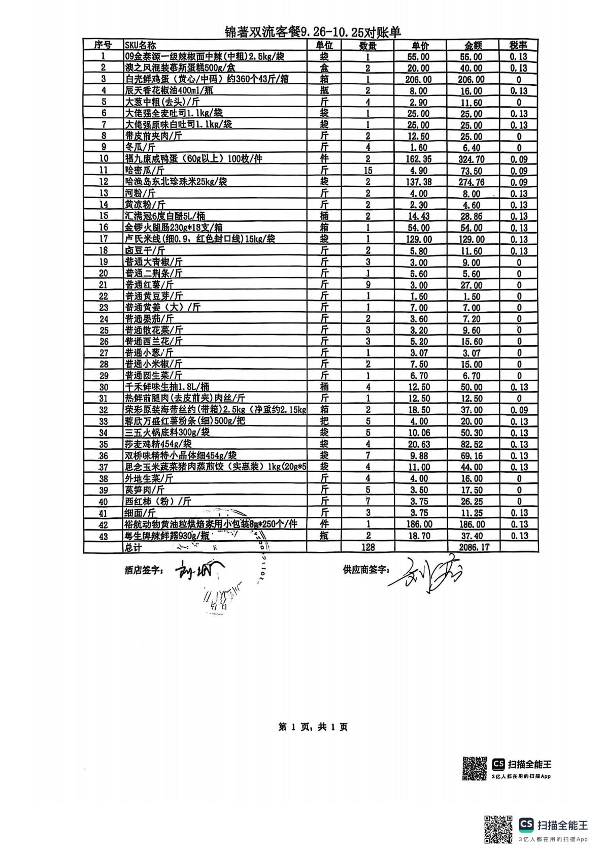 新良酒店客餐9.26-10.25对账单 合计金额:10132.04