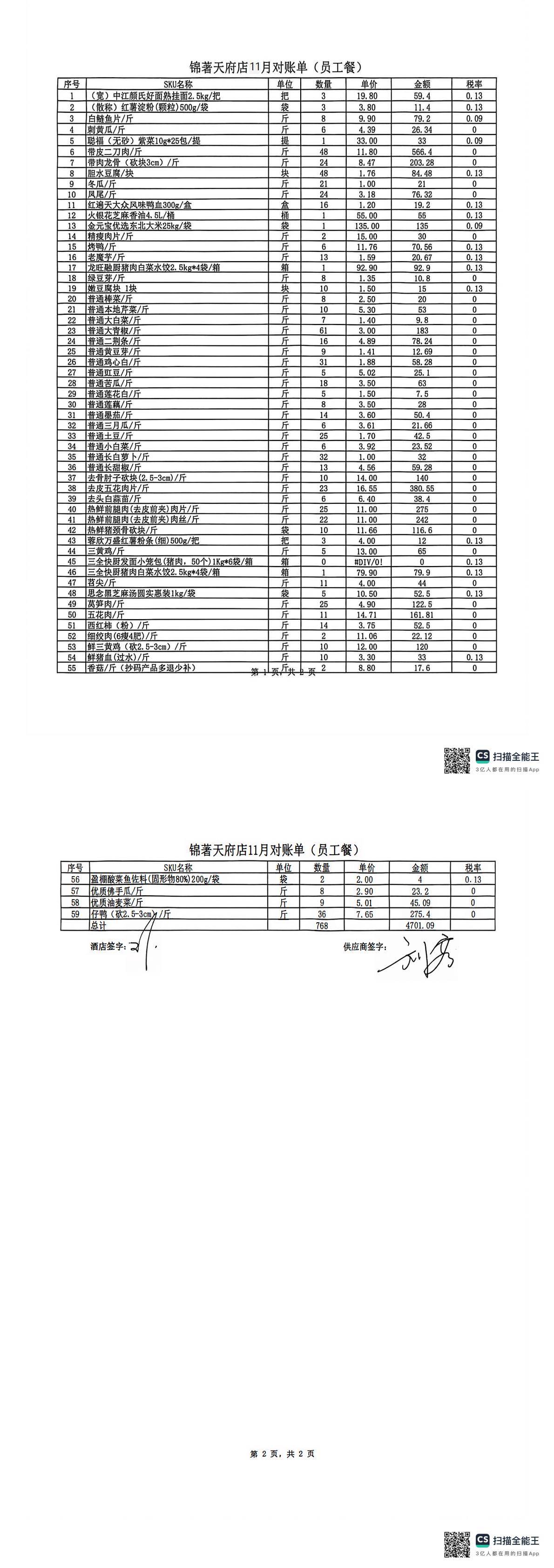 锦著天府店11月对账单(员工餐) 合计金额:4701.09