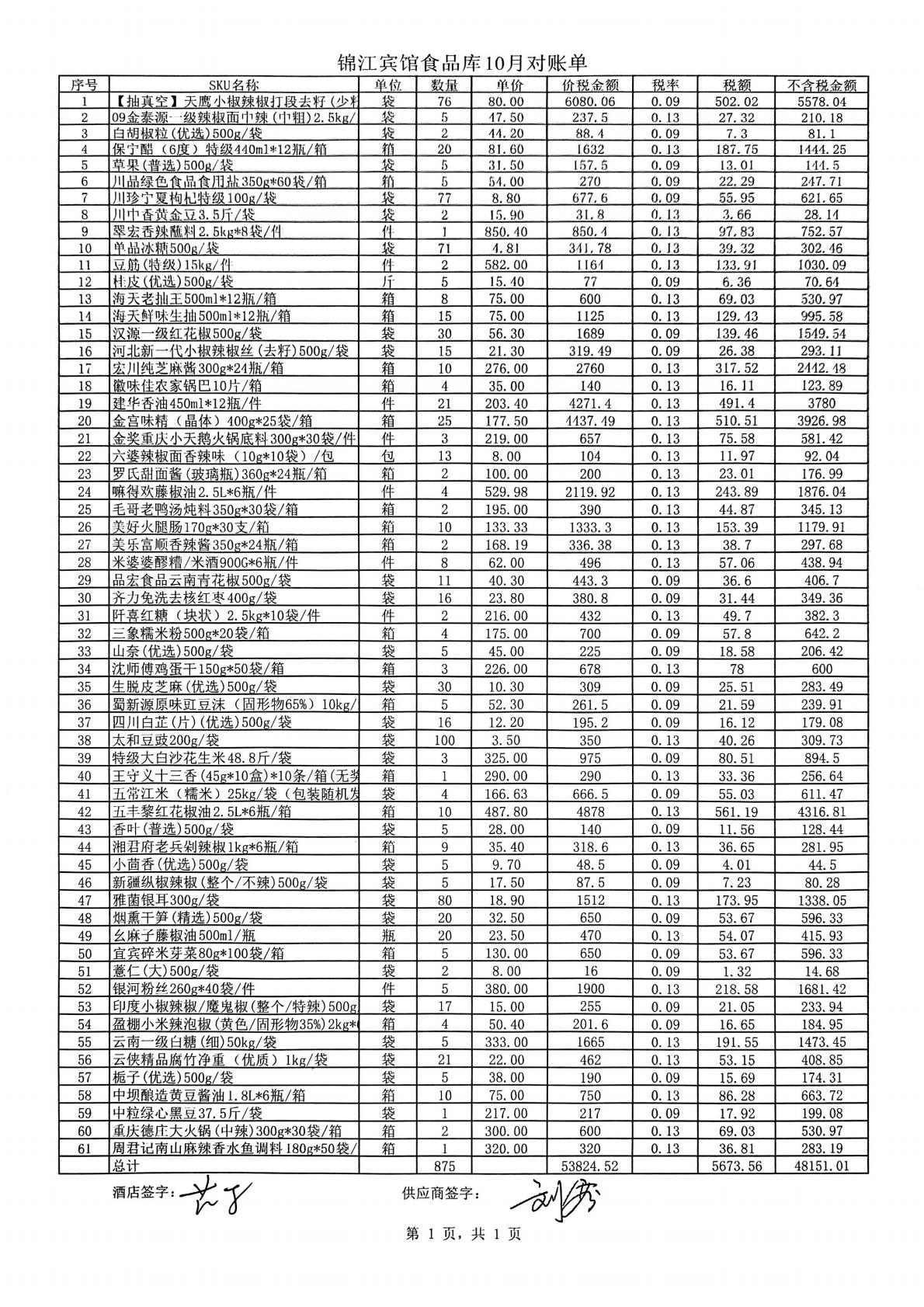 锦著天府店11月对账单(员工餐) 合计金额:4701.09