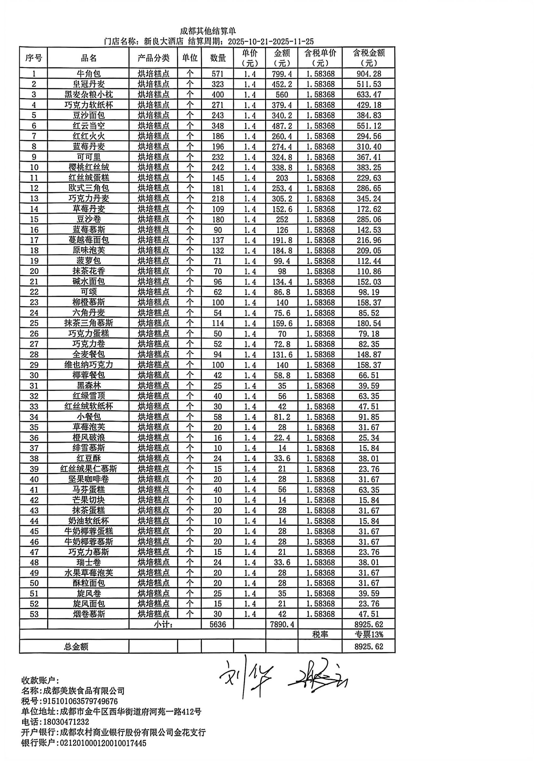 新良大酒店餐饮部2025年10.21-11.25食材采购款8925.62元