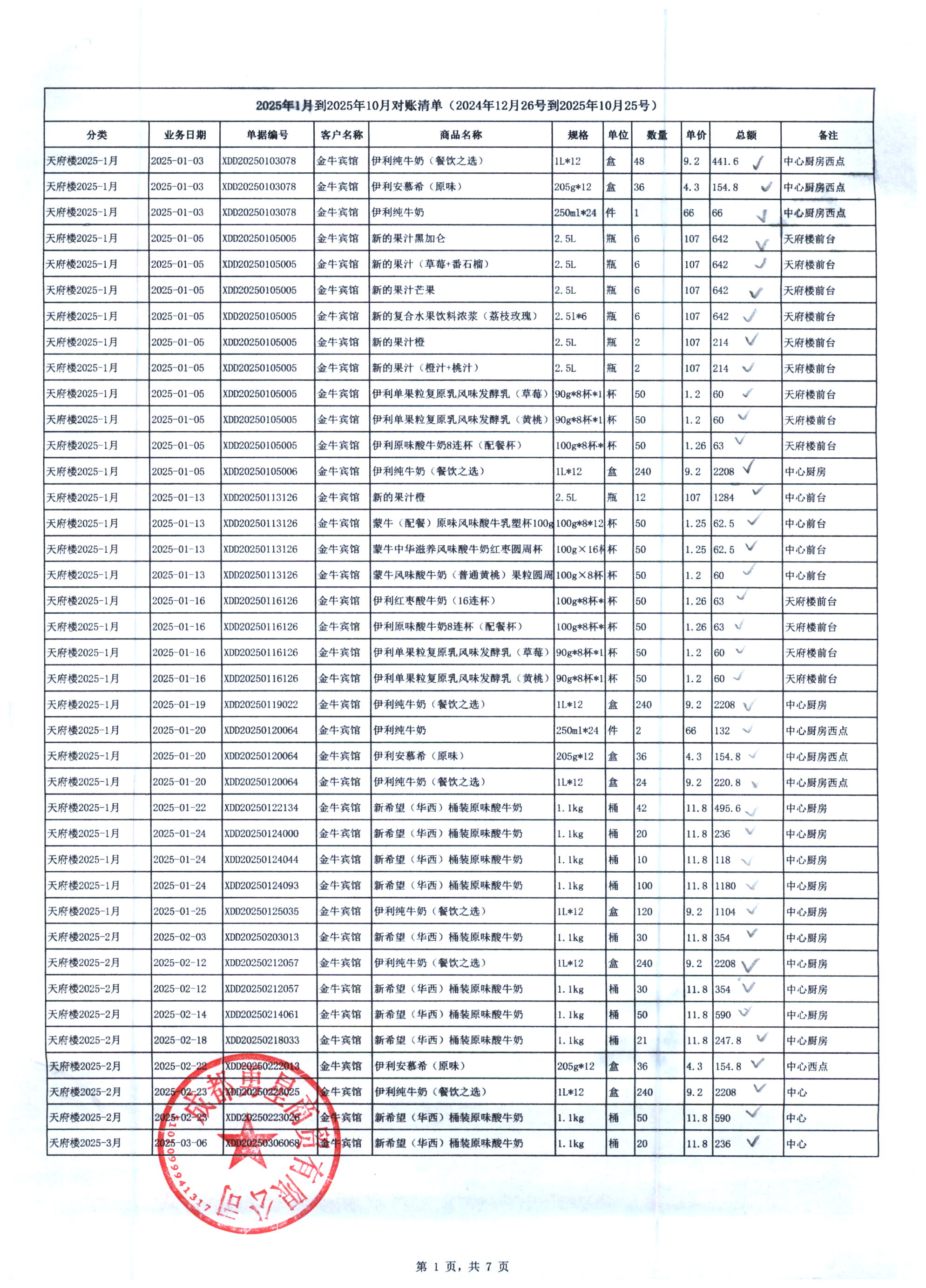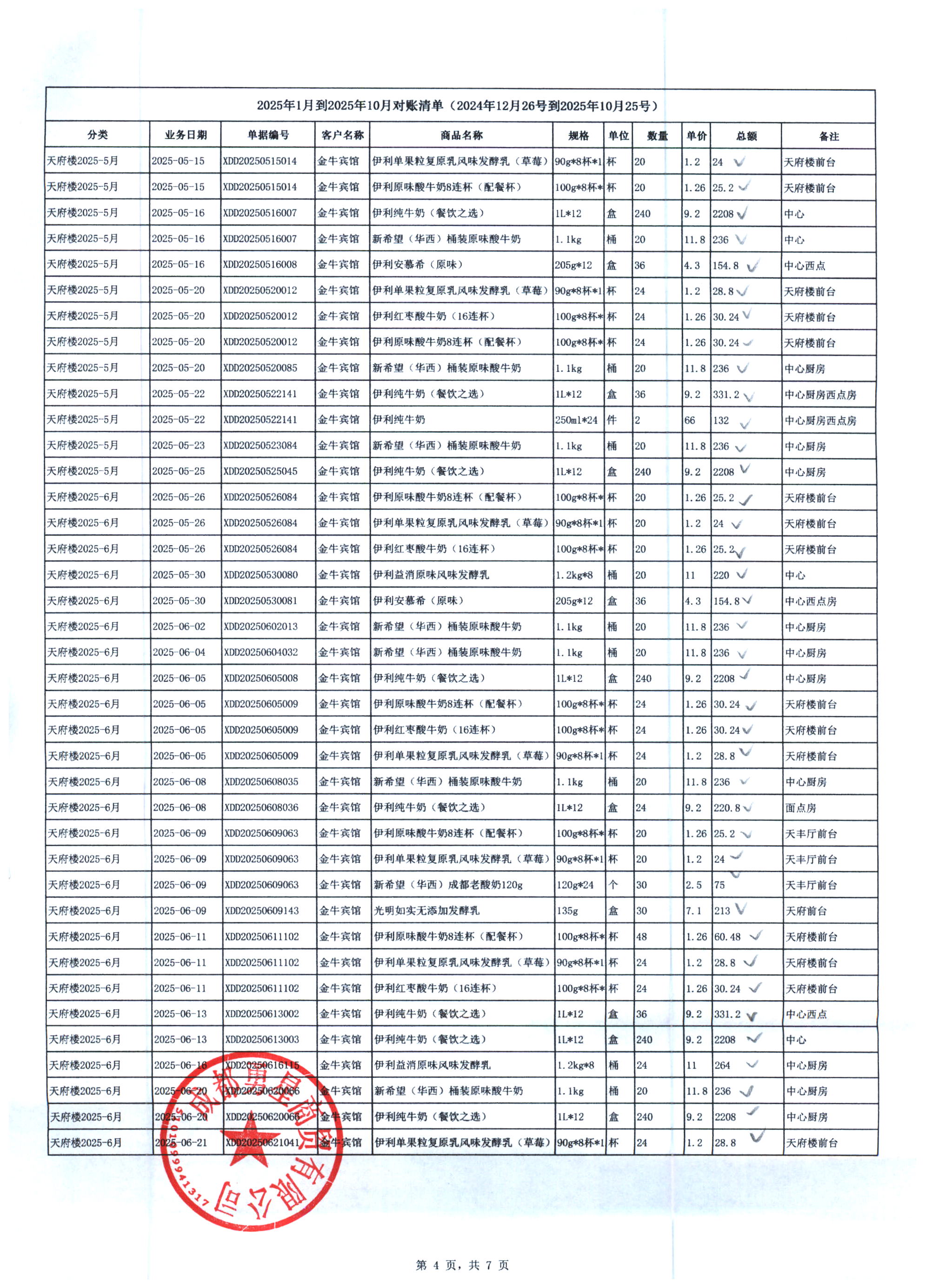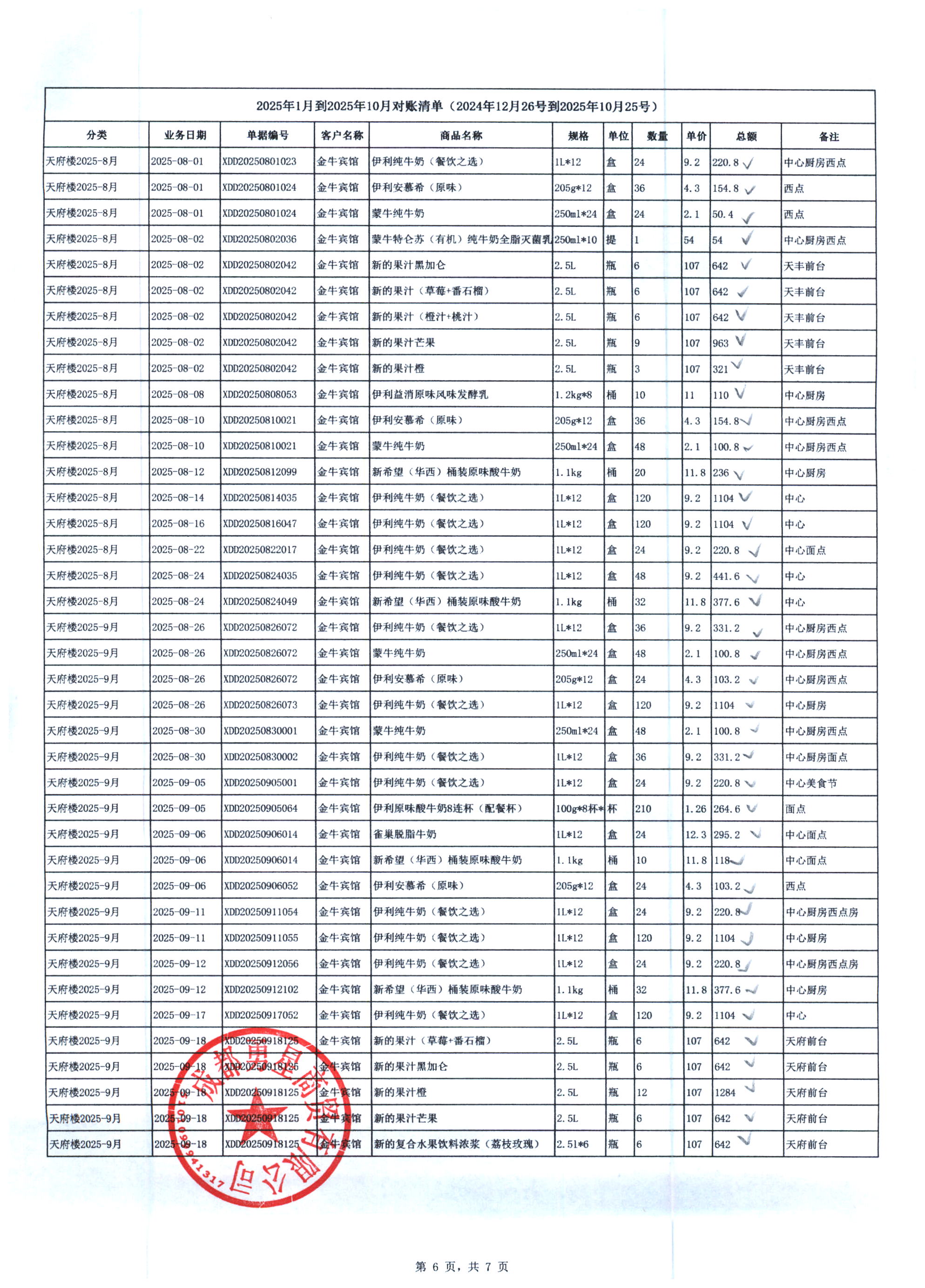 成都勇星商贸有限公司 金牛宾馆 天府楼 2025年1月-10月奶制品货款