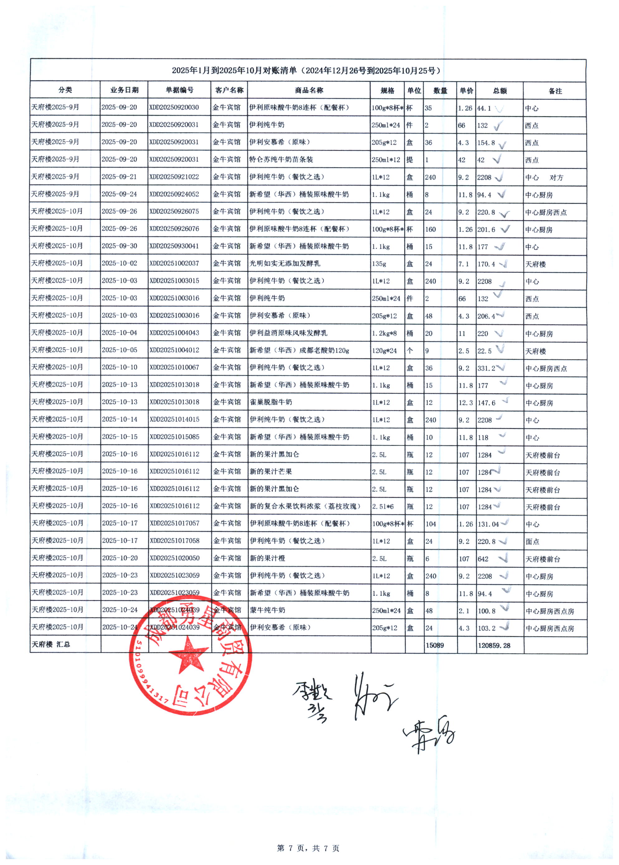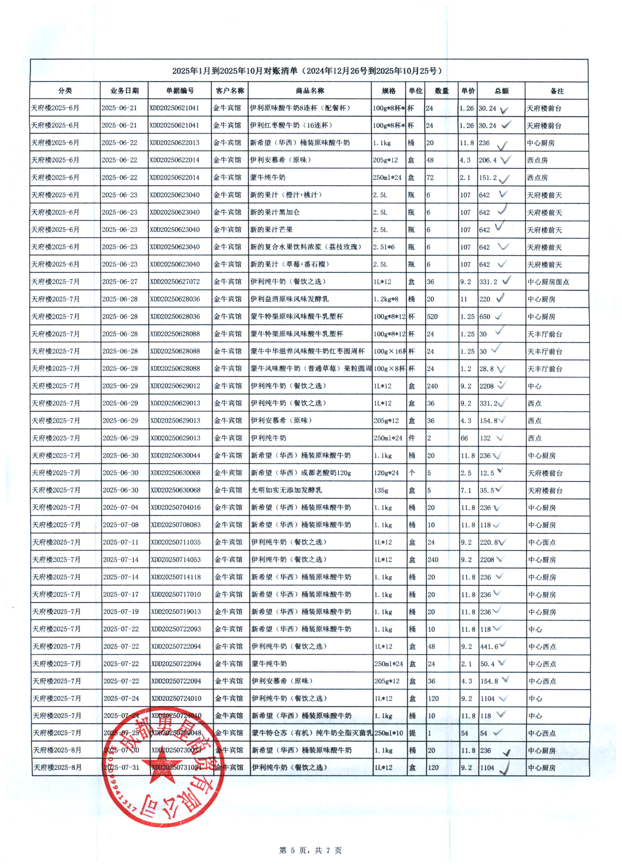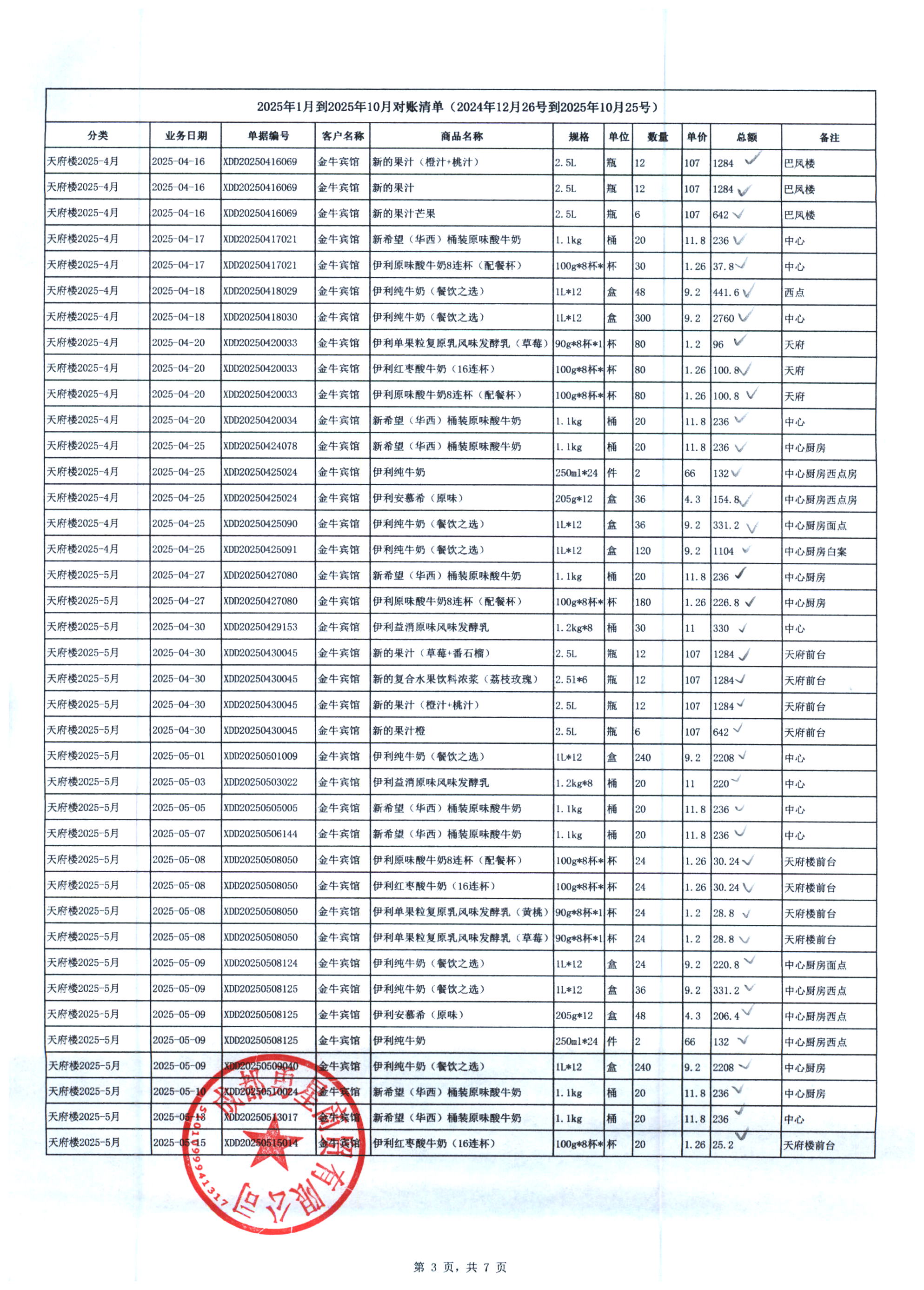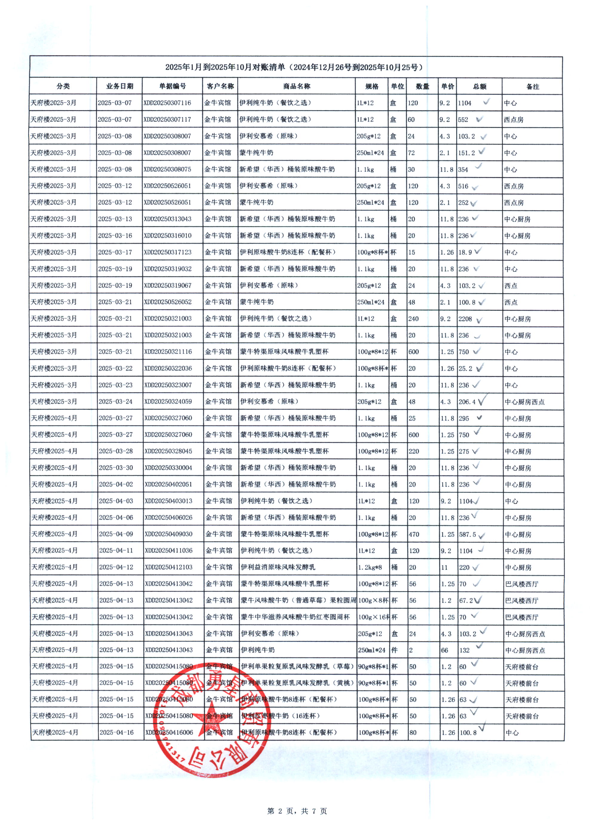 成都勇星商贸有限公司 金牛宾馆 天府楼 2025年1月-10月奶制品货款