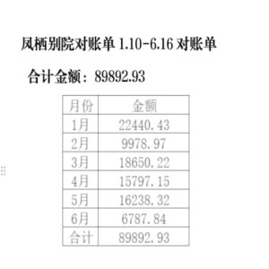 凤栖别院对账单1.10-6.16对账单 合计金额:89892.93