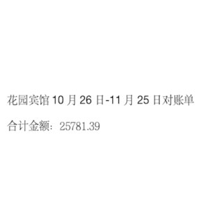 花园宾馆10月26日-11月25日对账单 合计金额:25781.39