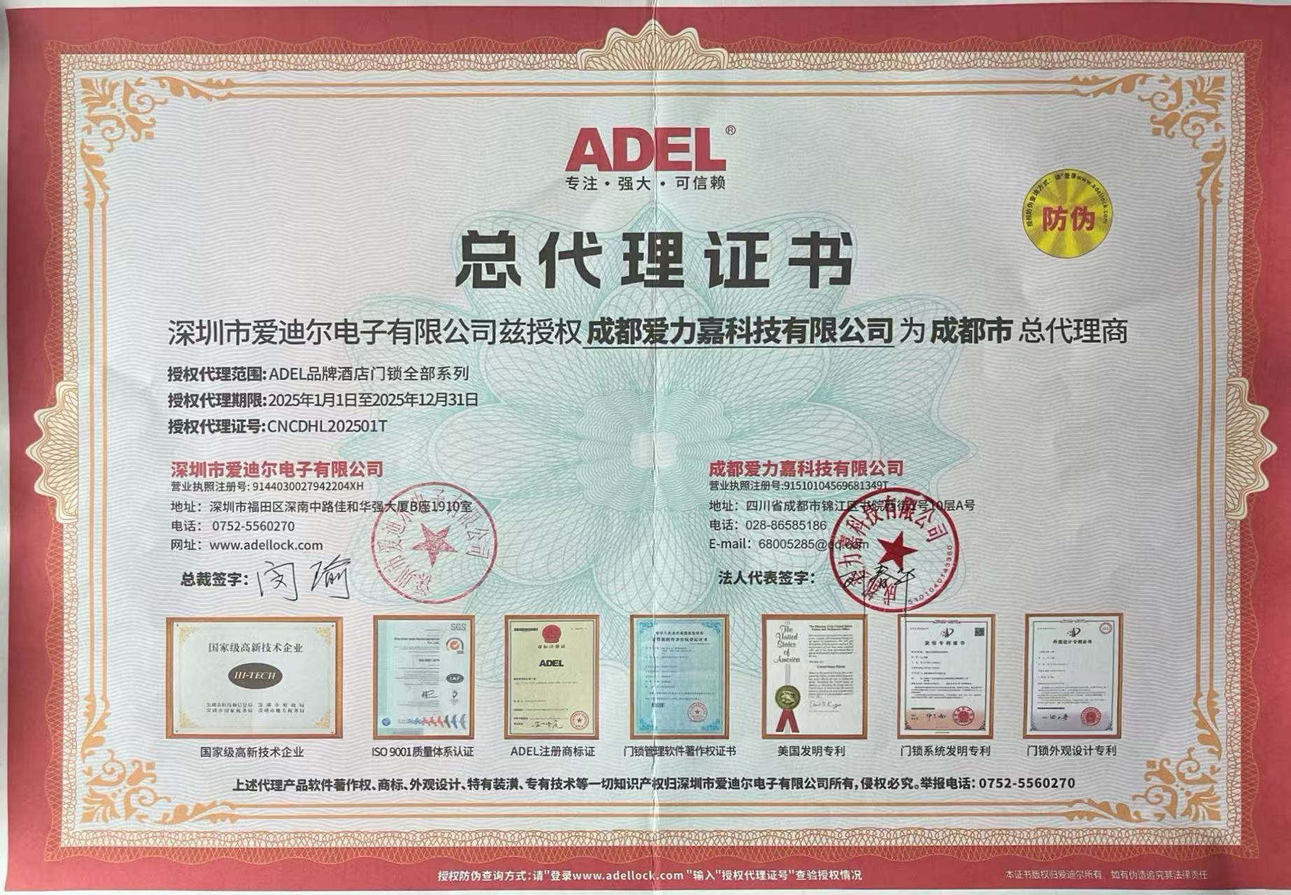 成都爱力嘉科技有限公司是ADEL集团在四川总代,主要从事ADEL酒店智能门锁销售、安装及售后服务的公司。成立于2011年03月21日,注册地位于四川省成都市锦江区书院西街1号10层A号,法定代表人为刘春华。主要经营范围:金属制品销售,五金产品零售,配电开关控制设备销售,软件销售,电子产品销售,办公用品销售,家电电器销售,照明器具销售,机械电气设备销售,计算机软硬件及辅助设备零售,集成电路销售等。